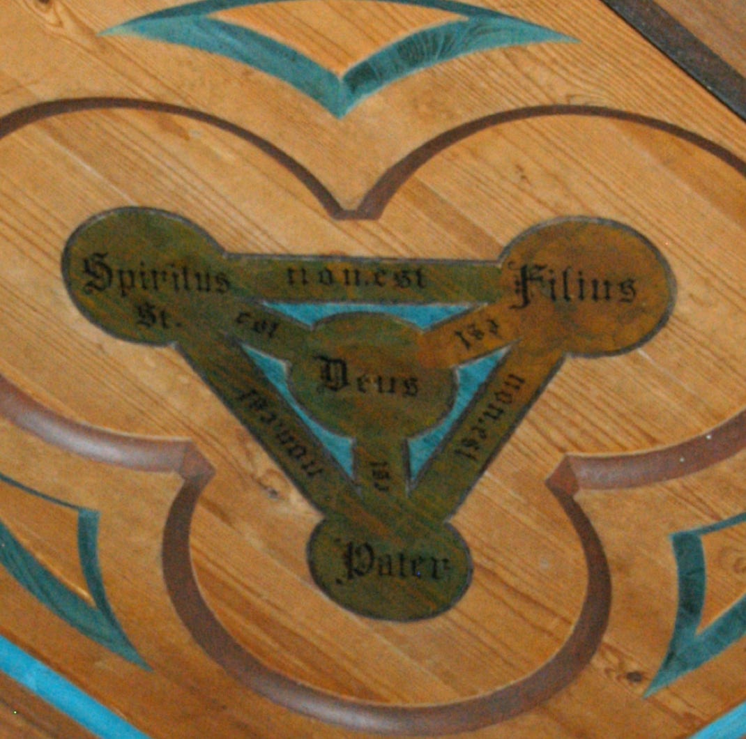 Hier die Darstellung der Dreifaltigkeit: Geist, Sohn und Vater sind verbunden mit „ist nicht“ und Gott im Zentrum sind jeweils in Kontakt mit Geist, Sohn und Vater, mit dem Wort „ist“.